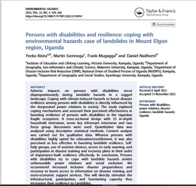 Kisira, Y., Ssennoga, M., Mugagga, F., & Nadhomi, D. (2023). Persons with disabilities and resilience: coping with environmental hazards case of landslides in Mount Elgon region, Uganda. Environmental Hazards, 22(4), 349-366.