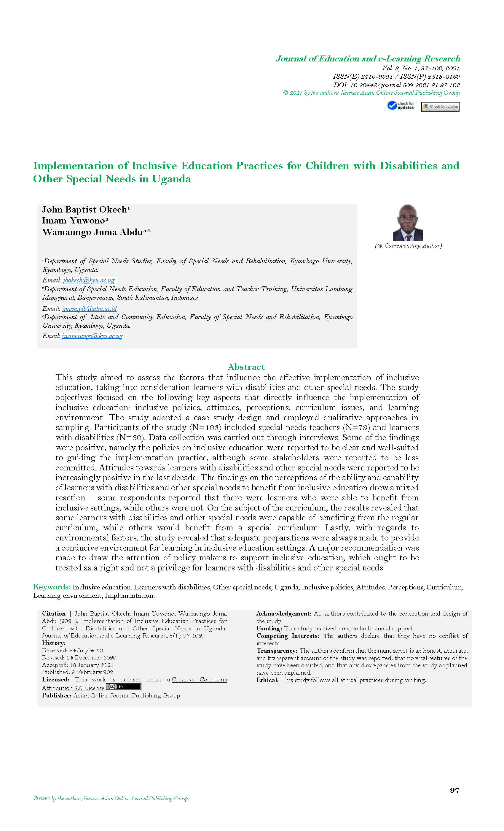 | dc.identifier.citation | John B. O.; Imam Y.; Wamaungo J. A. (2021). Implementation of Inclusive Education Practices for Children with Disabilities and Other Special Needs in Uganda. Journal of Education and e-Learning Research, 8(1): 97-102. | en_US |