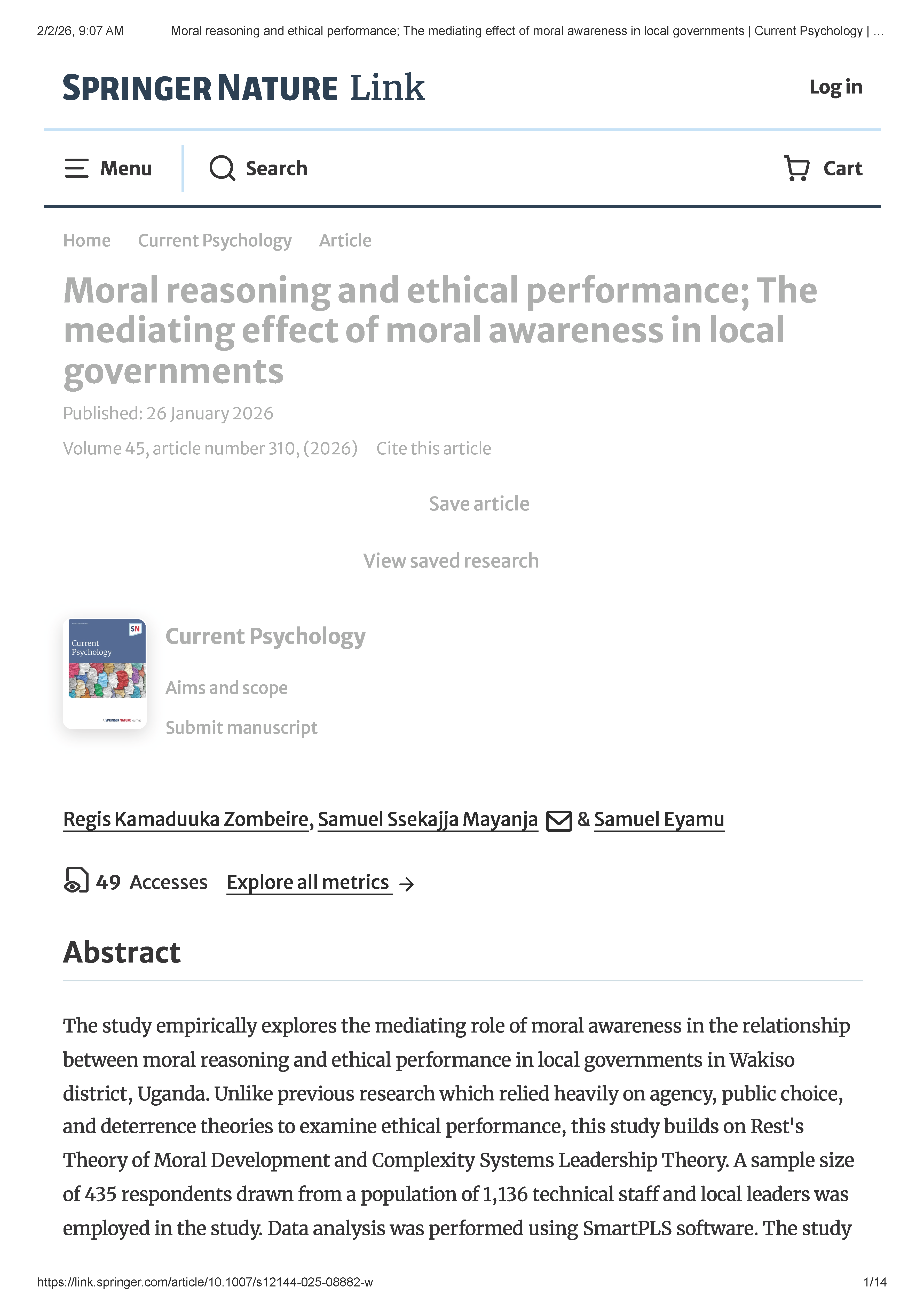 Zombeire, R.K., Mayanja, S.S. & Eyamu, S. Moral reasoning and ethical performance; The mediating effect of moral awareness in local governments. Curr Psychol 45, 310 (2026). https://doi.org/10.1007/s12144-025-08882-w