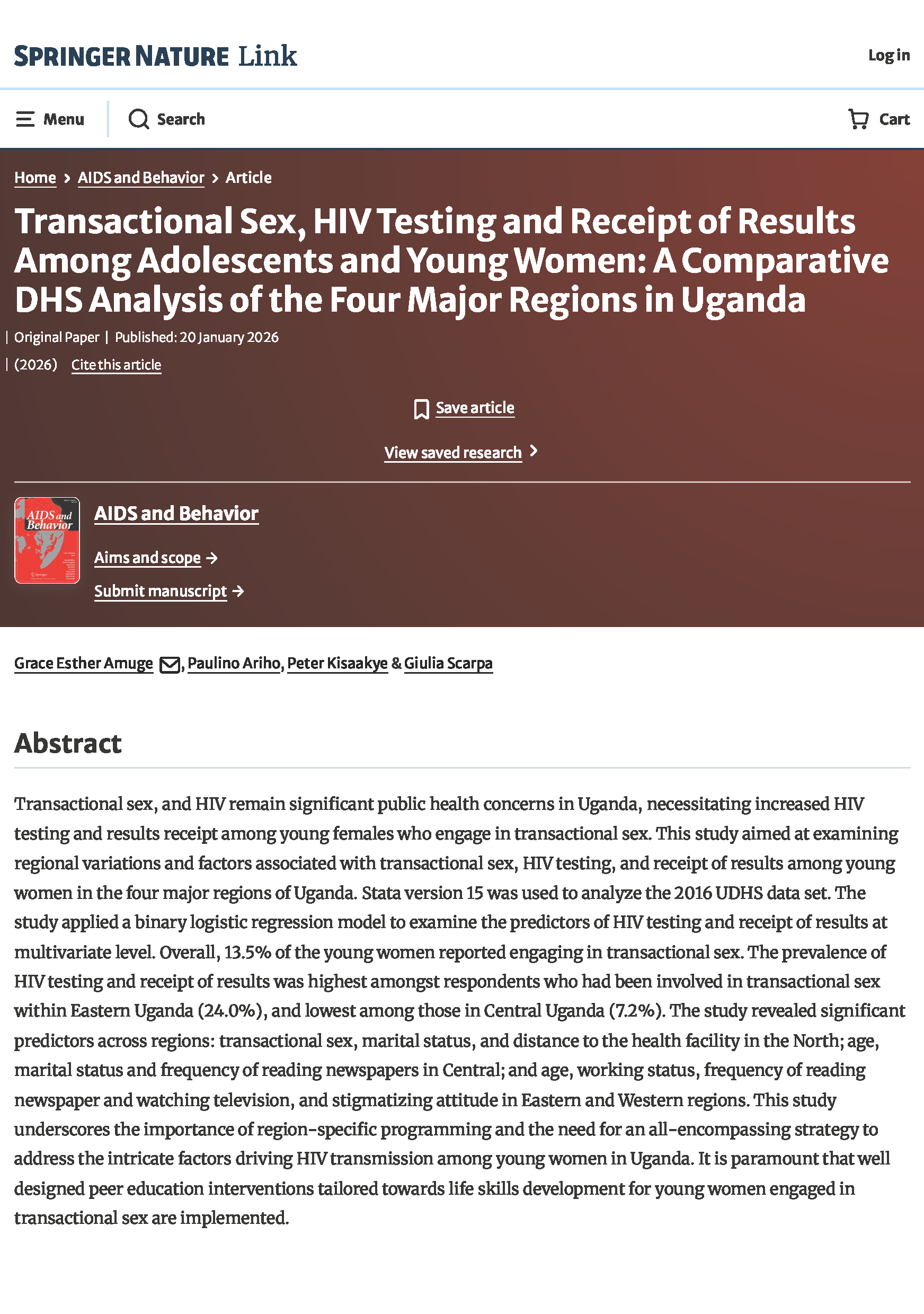 Amuge, G.E., Ariho, P., Kisaakye, P. et al. (2026) Transactional sex, HIV testing and receipt of results among adolescents and young women: a comparative DHS analysis of the four major regions in Uganda. AIDS and Behavior https://doi.org/10.1007/s10461-025-05020-2
