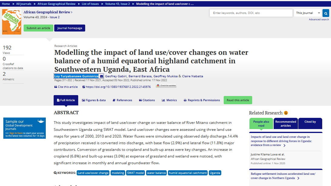 | dc.identifier.citation | Turyabanawe Gumisiriza, L., Gabiri, G., Barasa, B., Mukisa, G., & Nabatta, C. (2022). Modelling the impact of land use/cover changes on water balance of a humid equatorial highland catchment in Southwestern Uganda, East Africa. African Geographical Review, 43(2), 311–332. | en_US |