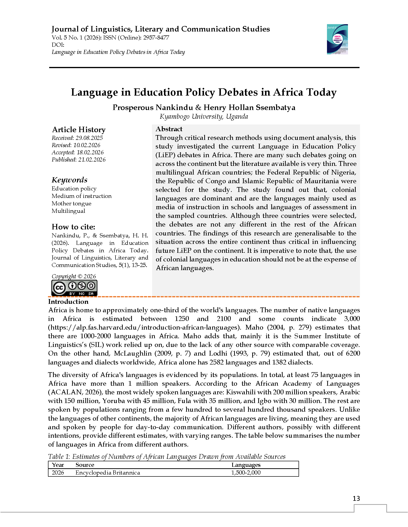 Nankindu, P., & Ssembatya, H. H. (2026). Language in Education Policy Debates in Africa Today. Journal of Linguistics, Literary and Communication Studies, 5(1), 13-25.