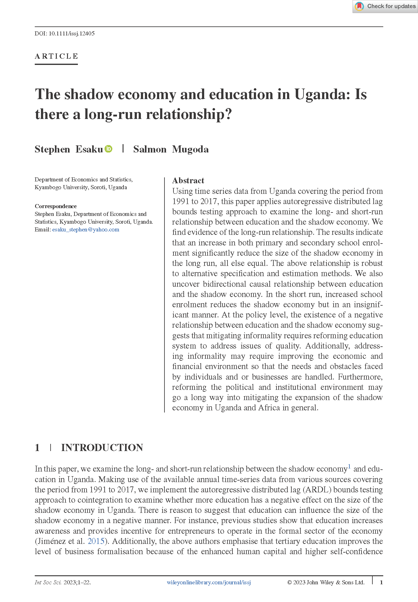 Esaku, S., & Mugoda, S. (2023). The shadow economy and education in Uganda: Is there a long‐run relationship?. International Social Science Journal.