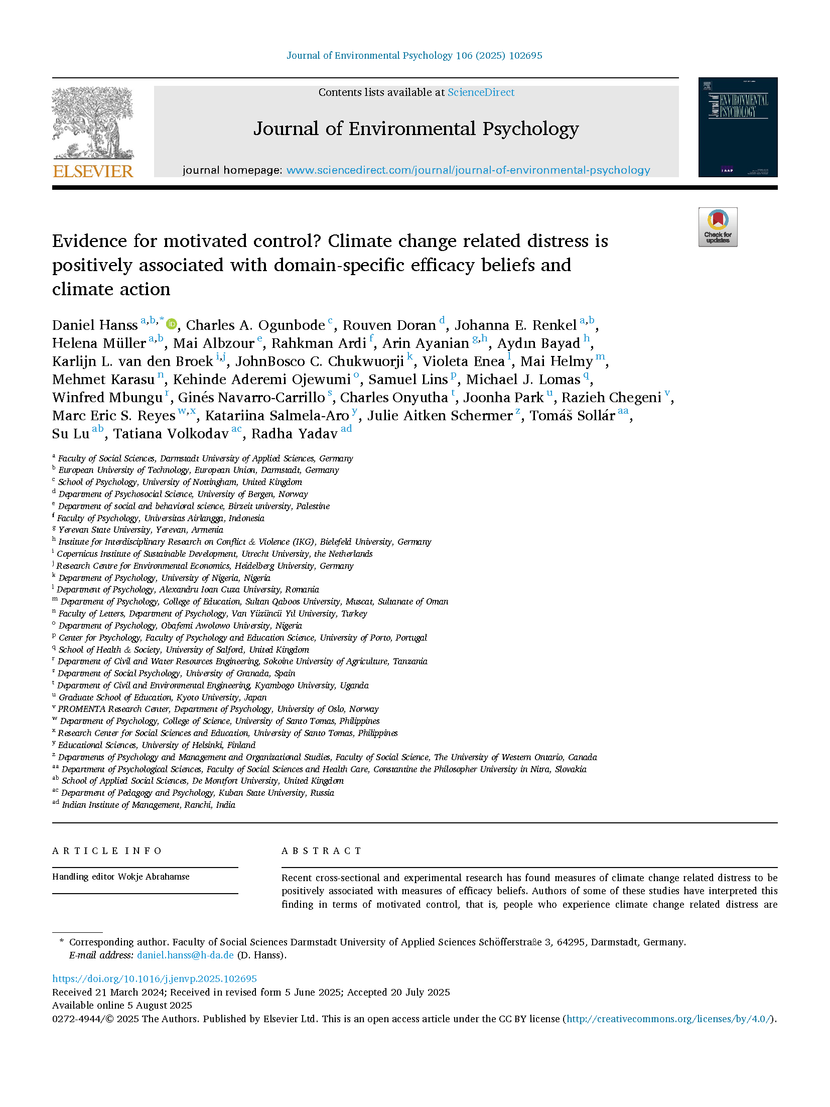| dc.identifier.citation | Hanss, D., Charles, A. O., Doran, R., Renkel, J. E., Müller, H., Albzour, M., ... & Yadav, R. (2025). Evidence for motivated control? Climate change related distress is positively associated with domain-specific efficacy beliefs and climate action. Journal of Environmental Psychology, 102695. | |