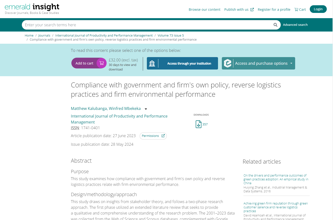 Kalubanga, M. and Mbekeka, W. (2024), "Compliance with government and firm's own policy, reverse logistics practices and firm environmental performance", International Journal of Productivity and Performance Management, Vol. 73 No. 5, pp. 1427-1478.