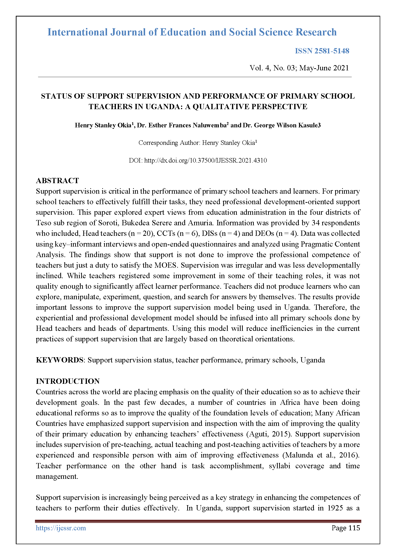 Okia, H. S., Naluwemba, E. F., & Kasule, G. W. (2021) Status of support supervision and performance of primary school teachers in uganda: a qualitative perspective.