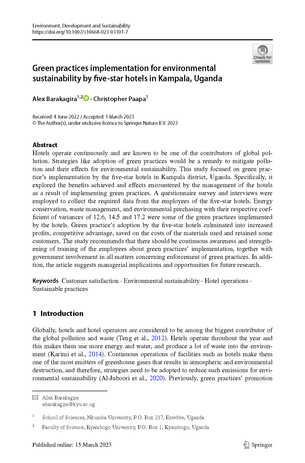 Barakagira, A., & Paapa, C. (2023). Green practices implementation for environmental sustainability by five-star hotels in Kampala, Uganda. Environment, Development and Sustainability, 1-17.