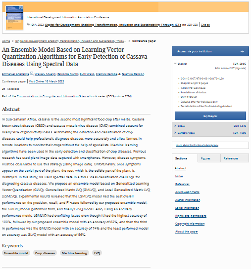 | dc.description.abstract | In Sub-Saharan Africa, cassava is the second most significant food crop after maize. Cassava brown streak disease (CBSD) and cassava mosaic virus disease (CMD) combined account for nearly 90% of productivity losses. Automating the detection and classification of crop diseases could help professionals diagnose diseases more accurately and allow farmers in remote locations to monitor their crops without the help of specialists. Machine learning algorithms have been used in the early detection and classification of crop diseases. Previous research has used plant image data captured with smartphones. However, disease symptoms must be observable to use this strategy (using image data). Unfortunately, once symptoms appear on the aerial part of the plant, the root, which is the edible part of the plant, is destroyed. In this study, we used spectral data in a three-class classification challenge for diagnosing cassava diseases. We propose an ensemble model based on Generalized Learning Vector Quantization (GLVQ), Generalized Matrix LVQ (GMLVQ), and Local Generalized Matrix LVQ (LGMLVQ). Experimental results revealed that the LGMLVQ model had the best overall performance on the precision, recall, and F1-score followed by our proposed ensemble model, the GMLVQ model performed third, and finally GLVQ model. Also, using an accuracy performance metric, LGMLVQ had overfitting issues even though it had the highest accuracy of 100%, followed by our proposed ensemble model with an accuracy of 82%, and then the third in performance was the GMLVQ model with an accuracy of 74% and the least performed model on accuracy was GLVQ model with an accuracy of 56%. | en_US |