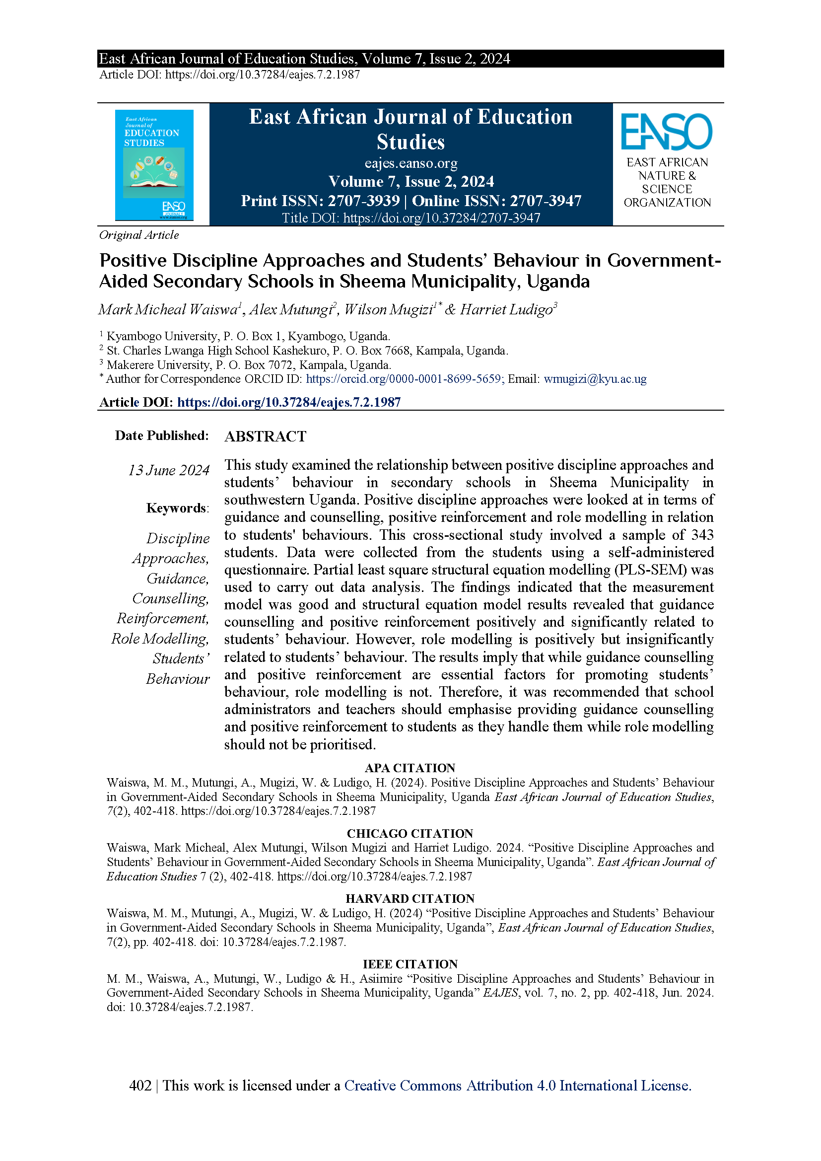 Waiswa, M. M., Mutungi, A., Mugizi, W., & Ludigo, H. (2024). Positive Discipline Approaches and Students’ Behaviour in Government-Aided Secondary Schools in Sheema Municipality, Uganda. East African Journal of Education Studies, 7(2), 402-418.