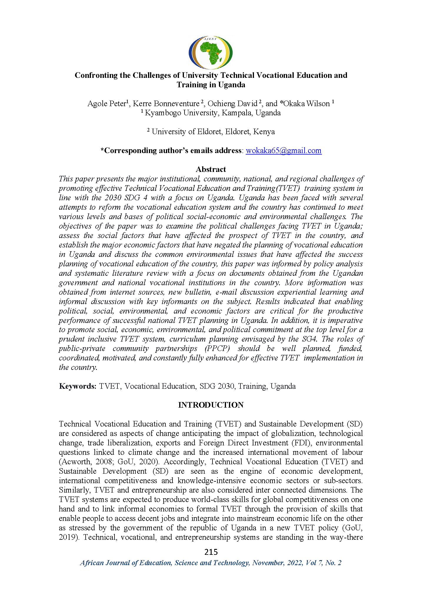Agole, P. , Bonneventure, K. ,Ochieng, D. & Okaka, W. (2022) Confronting the Challenges of University Technical Vocational Education and Training in Uganda