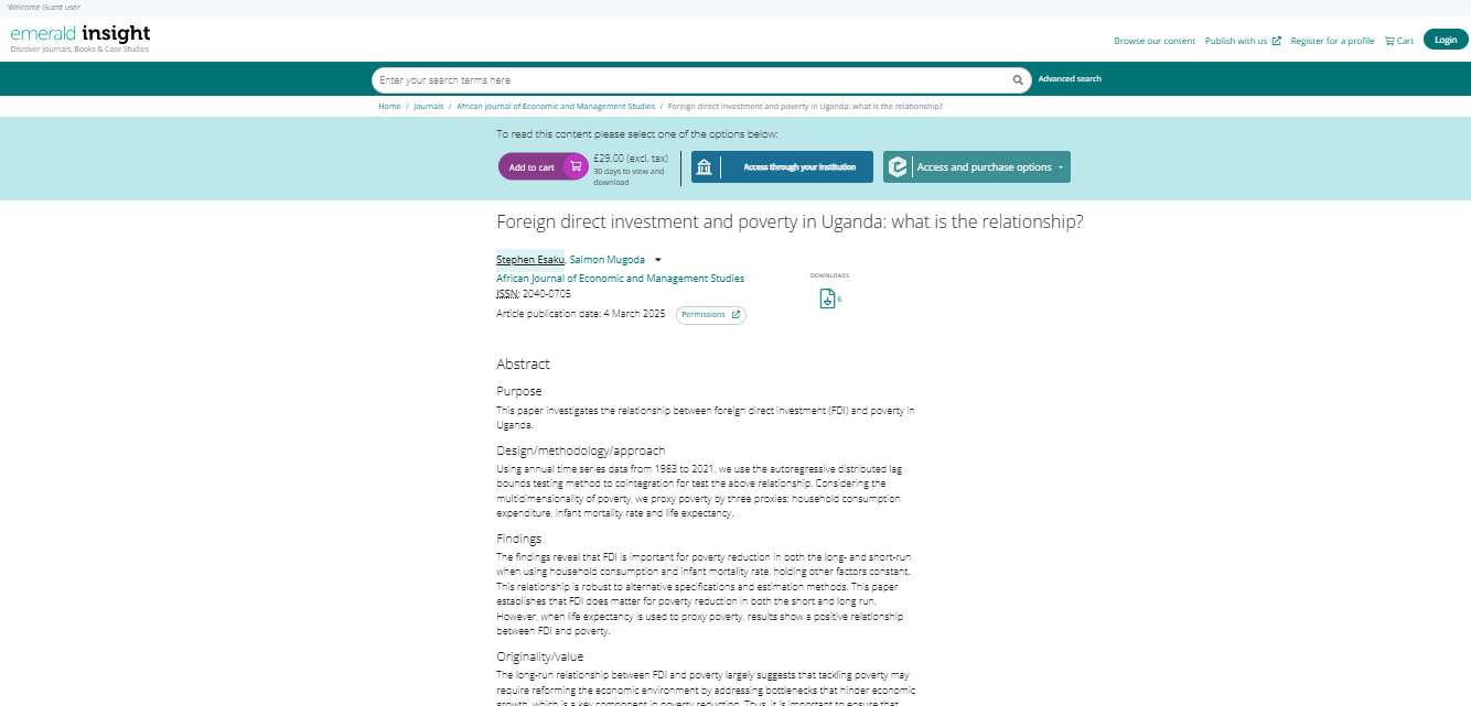 Esaku, S., & Mugoda, S. (2025). Foreign direct investment and poverty in Uganda: what is the relationship?. African Journal of Economic and Management Studies.
