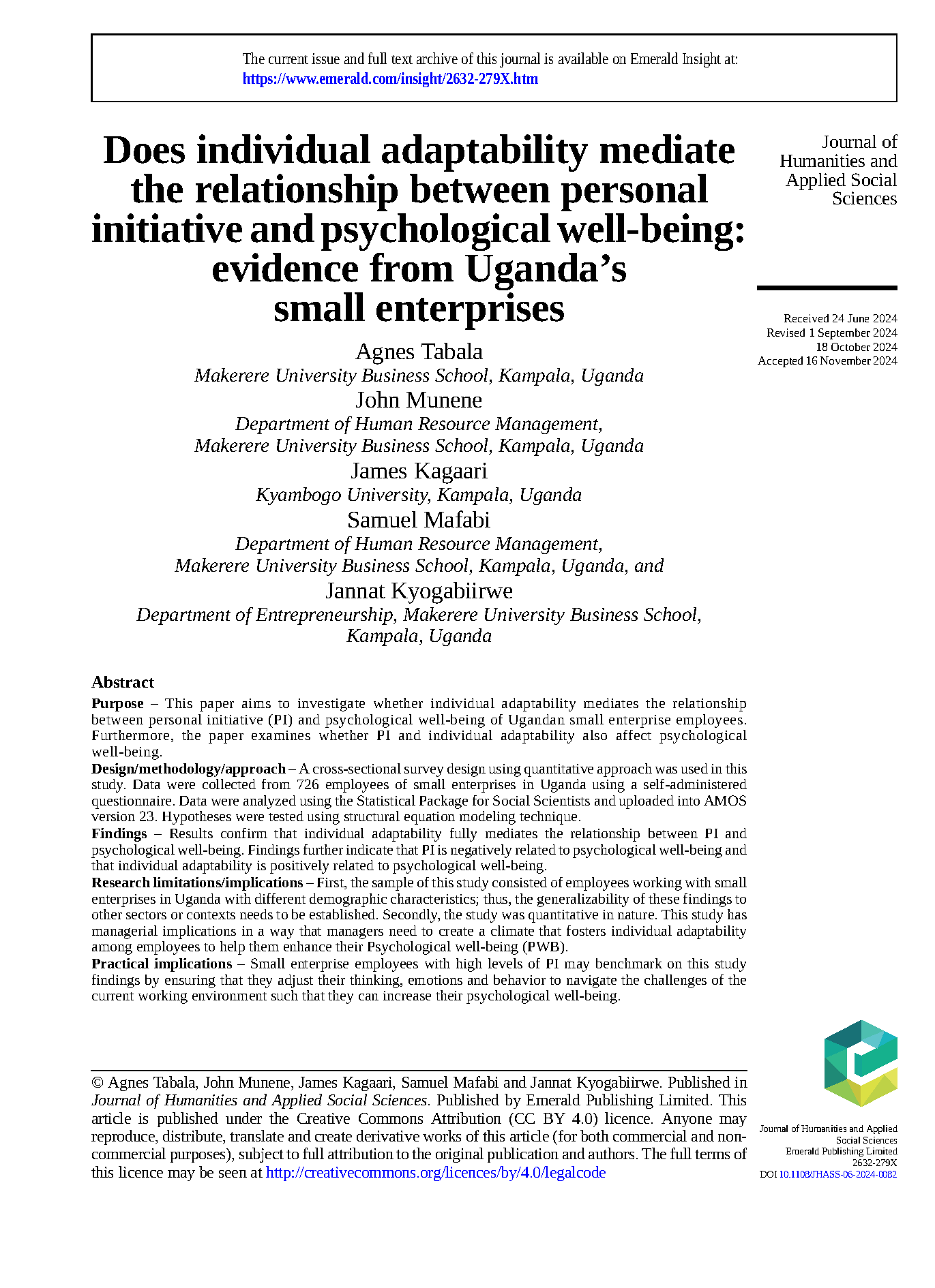 Tabala, A., Munene, J., Kagaari, J., Mafabi, S., & Kyogabiirwe, J. (2024). Does individual adaptability mediate the relationship between personal initiative and psychological well-being: evidence from Uganda’s small enterprises. Journal of Humanities and Applied Social Sciences.