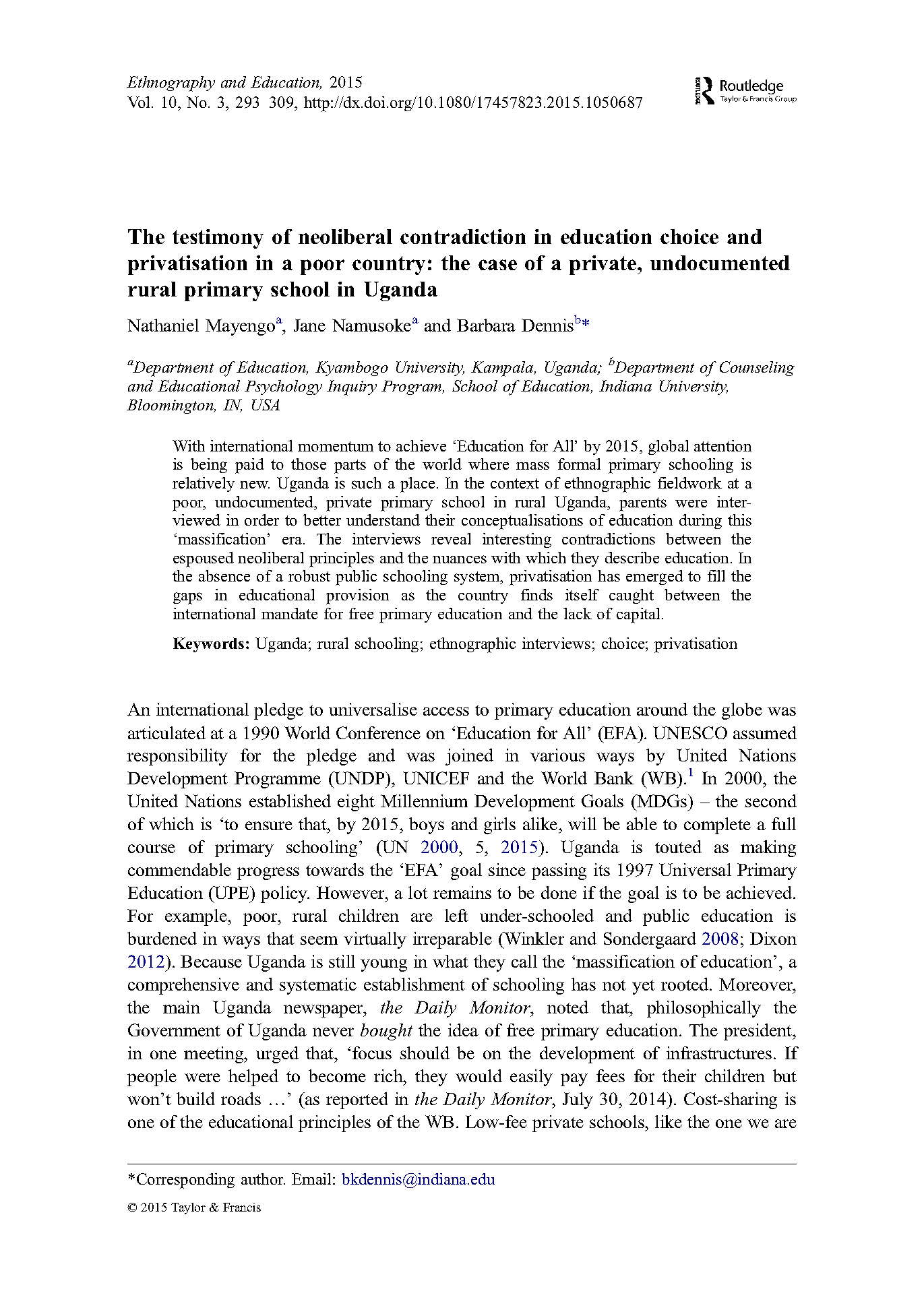 | dc.identifier.citation | Mayengo, N., Namusoke, J., & Dennis, B. (2015). The testimony of neoliberal contradiction in education choice and privatisation in a poor country: the case of a private, undocumented rural primary school in Uganda. Ethnography and Education, 10(3), 293-309. | en_US |