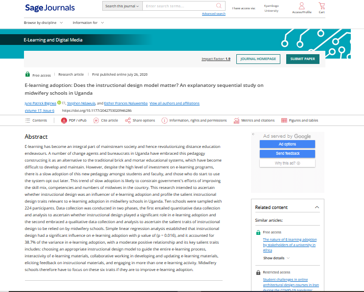 Bigirwa, J. P., Ndawula, S., & Naluwemba, E. F. (2020). E-learning adoption: Does the instructional design model matter? An explanatory sequential study on midwifery schools in Uganda. E-Learning and Digital Media, 17(6), 460-481.
