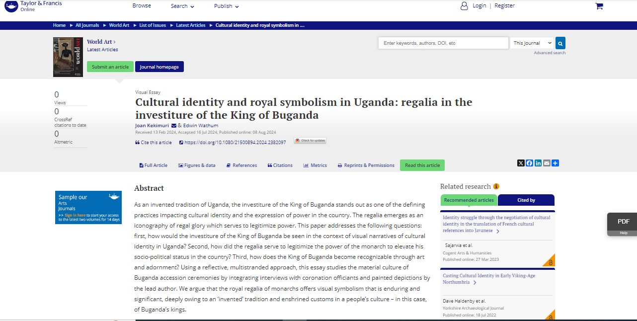 Kekimuri, J., & Wathum, E. (2024). Cultural identity and royal symbolism in Uganda: regalia in the investiture of the King of Buganda. World Art, 1-23.
