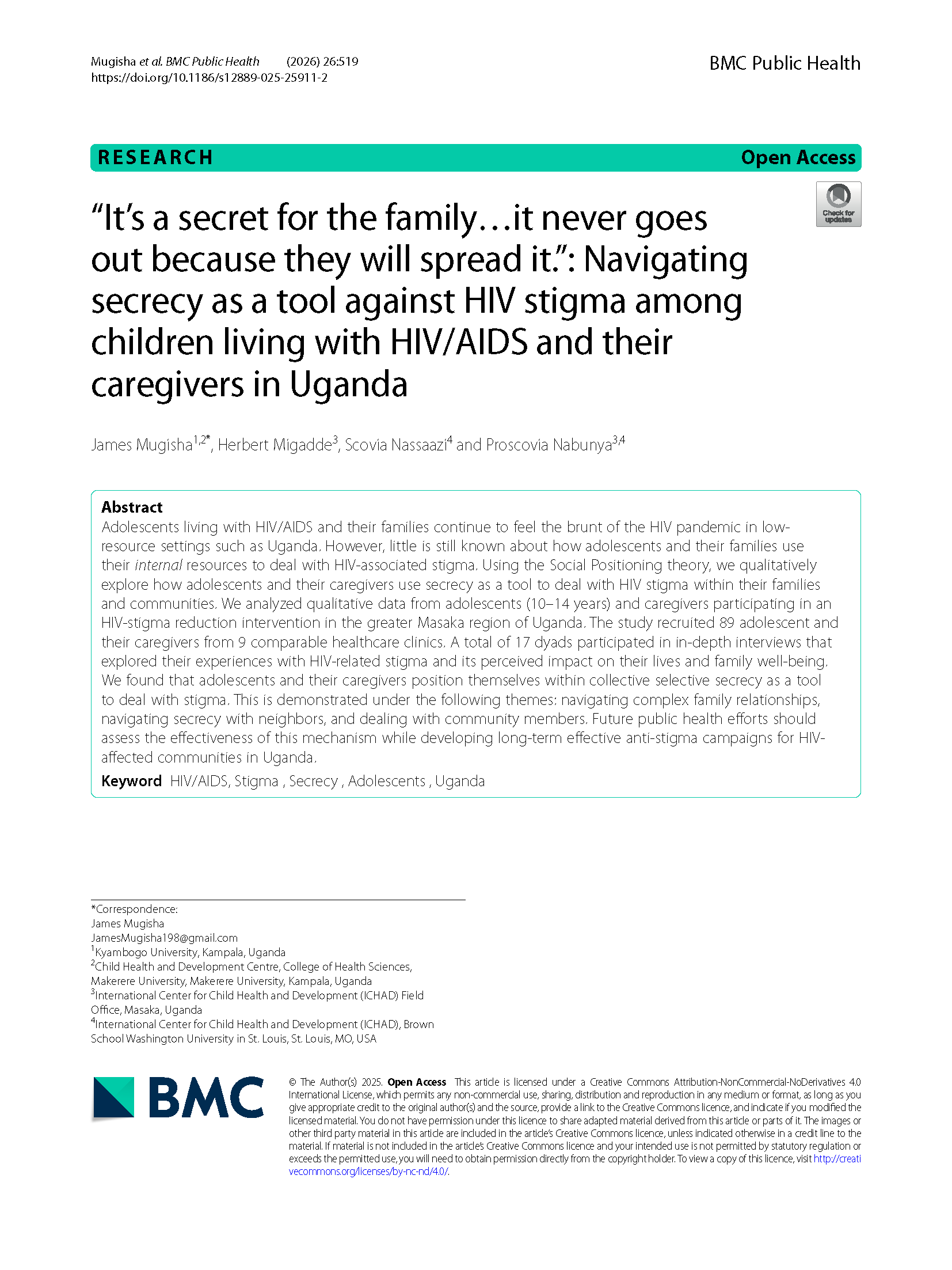 Mugisha, J., Migadde, H., Nassaazi, S., & Nabunya, P. (2025). “It’sa secret for the family… it never goes out because they will spread it.”: Navigating secrecy as a tool against HIV stigma among children living with HIV/AIDS and their caregivers in Uganda. BMC Public Health.