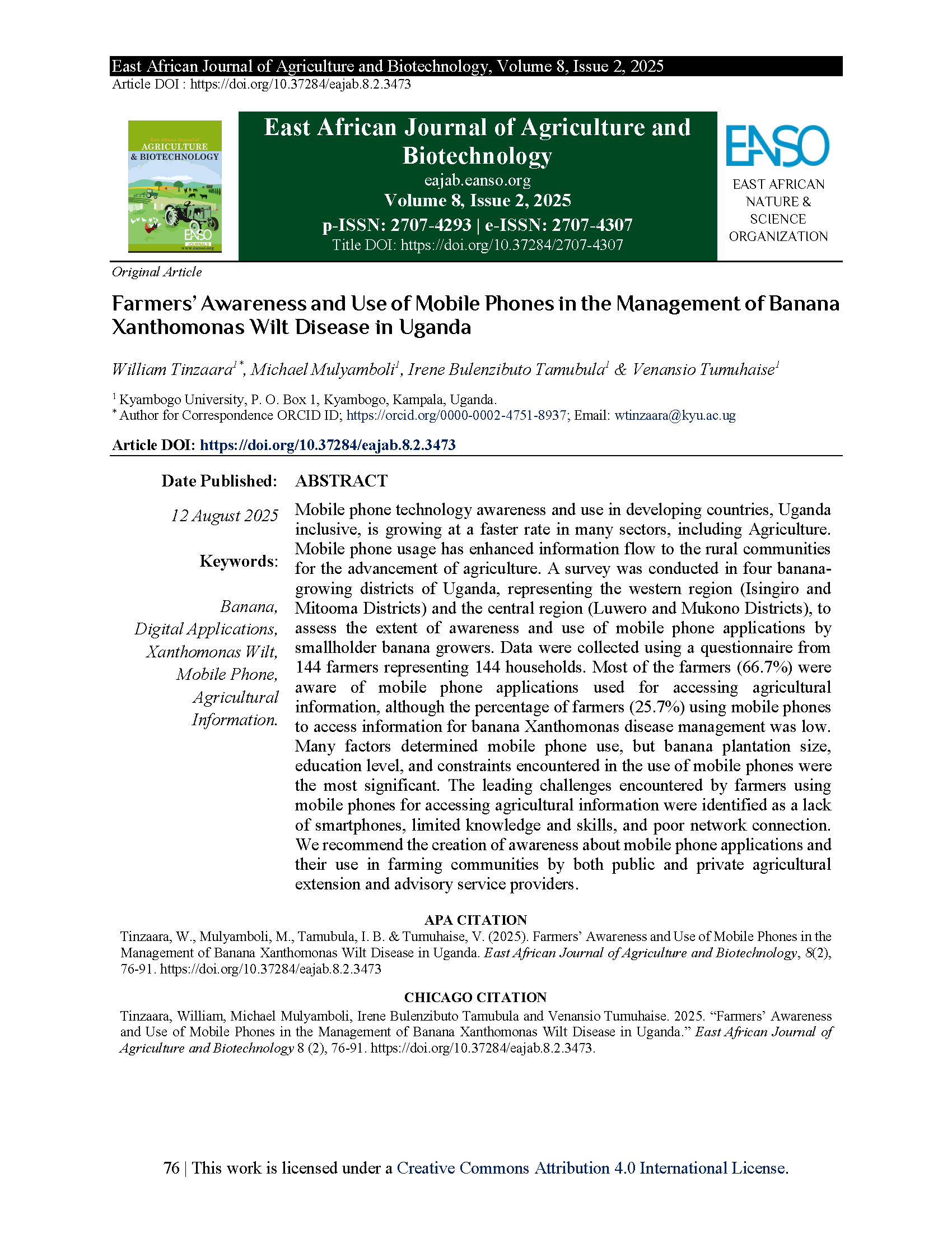 Tinzaara, W., Mulyamboli, M., Tamubula, I. B. & Tumuhaise, V. (2025). Farmers’ Awareness and Use of Mobile Phones in the Management of Banana Xanthomonas Wilt Disease in Uganda. East African Journal of Agriculture and Biotechnology, 8(2), 76-91. https://doi.org/10.37284/eajab.8.2.3473