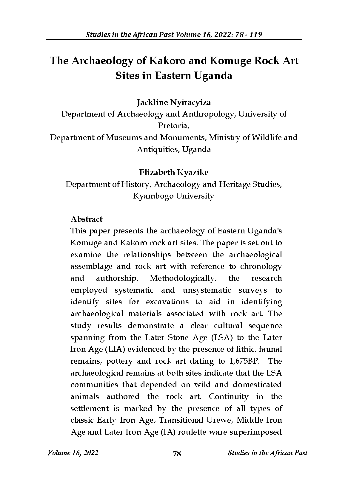 Nyiracyiza, J. (2023). The Archaeology of Kakoro and Komuge Rock Art Sites in Eastern Uganda. Studies in the African Past, 16(1).