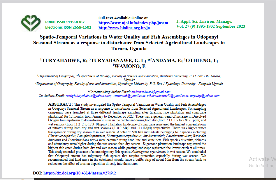 | dc.identifier.citation | Turyahabwe, R., Turyabanawe, G. L., Andama, E., Othieno, T., & Wamono, E. (2023). Spatio-Temporal Variations in Water Quality and Fish Assemblages in Odoponyi Seasonal Stream as a response to disturbance from Selected Agricultural Landscapes in Tororo, Uganda. Journal of Applied Sciences and Environmental Management, 27(9), 1895-1902. | en_US |