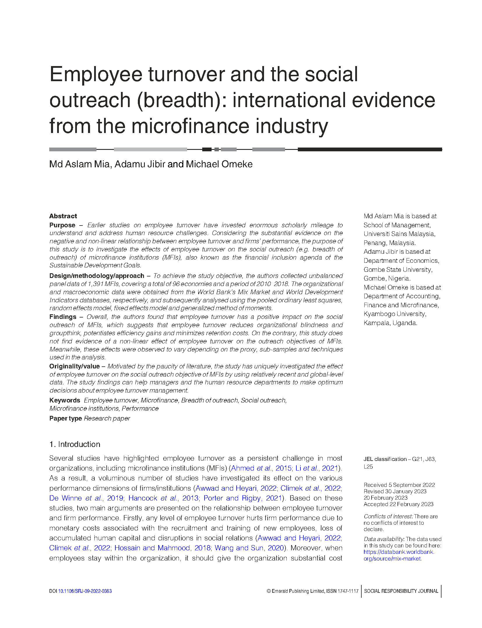 Mia, M. A., Jibir, A., & Omeke, M. (2023). Employee turnover and the social outreach (breadth): international evidence from the microfinance industry. Social Responsibility Journal.