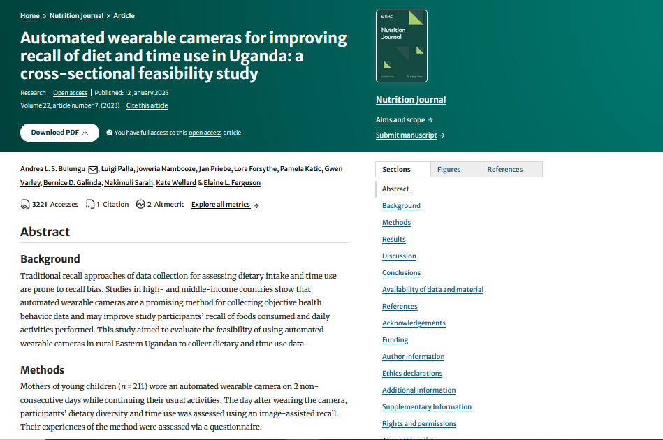 Bulungu, A. L., Palla, L., Nambooze, J., Priebe, J., Forsythe, L., Katic, P., ... & Ferguson, E. L. (2023). Automated wearable cameras for improving recall of diet and time use in Uganda: a cross-sectional feasibility study. Nutrition journal, 22(1), 7.