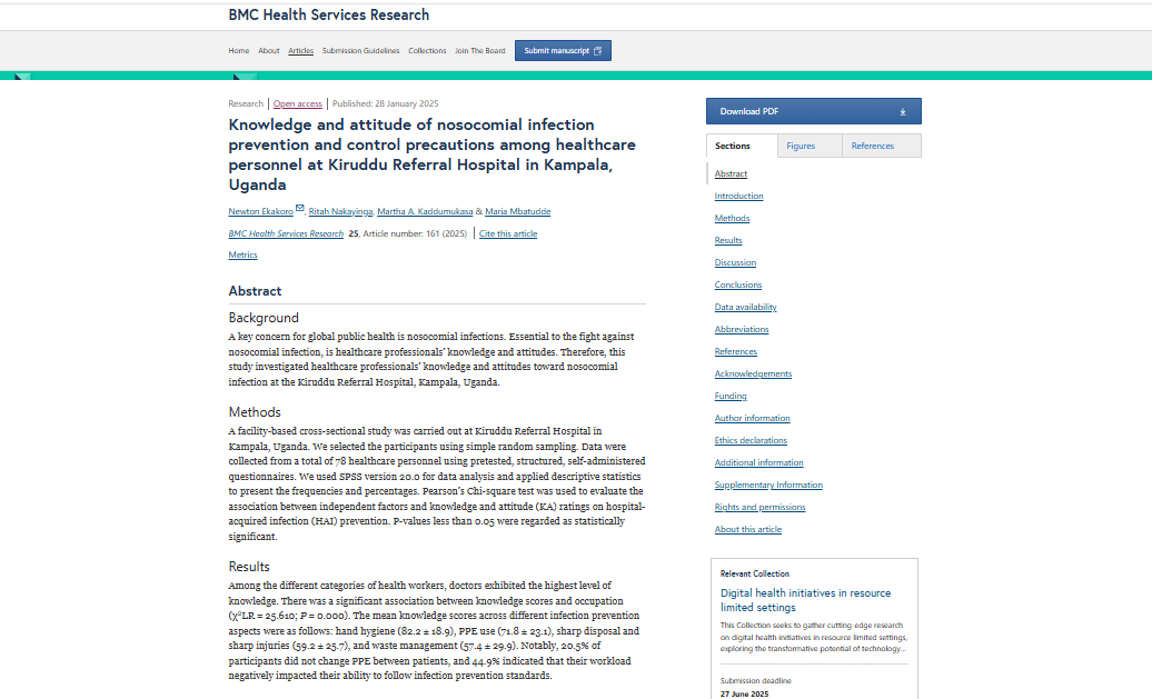 Ekakoro, N., Nakayinga, R., Kaddumukasa, M. A., & Mbatudde, M. (2025). Knowledge and attitude of nosocomial infection prevention and control precautions among healthcare personnel at Kiruddu Referral Hospital in Kampala, Uganda. BMC Health Services Research, 25, 161.