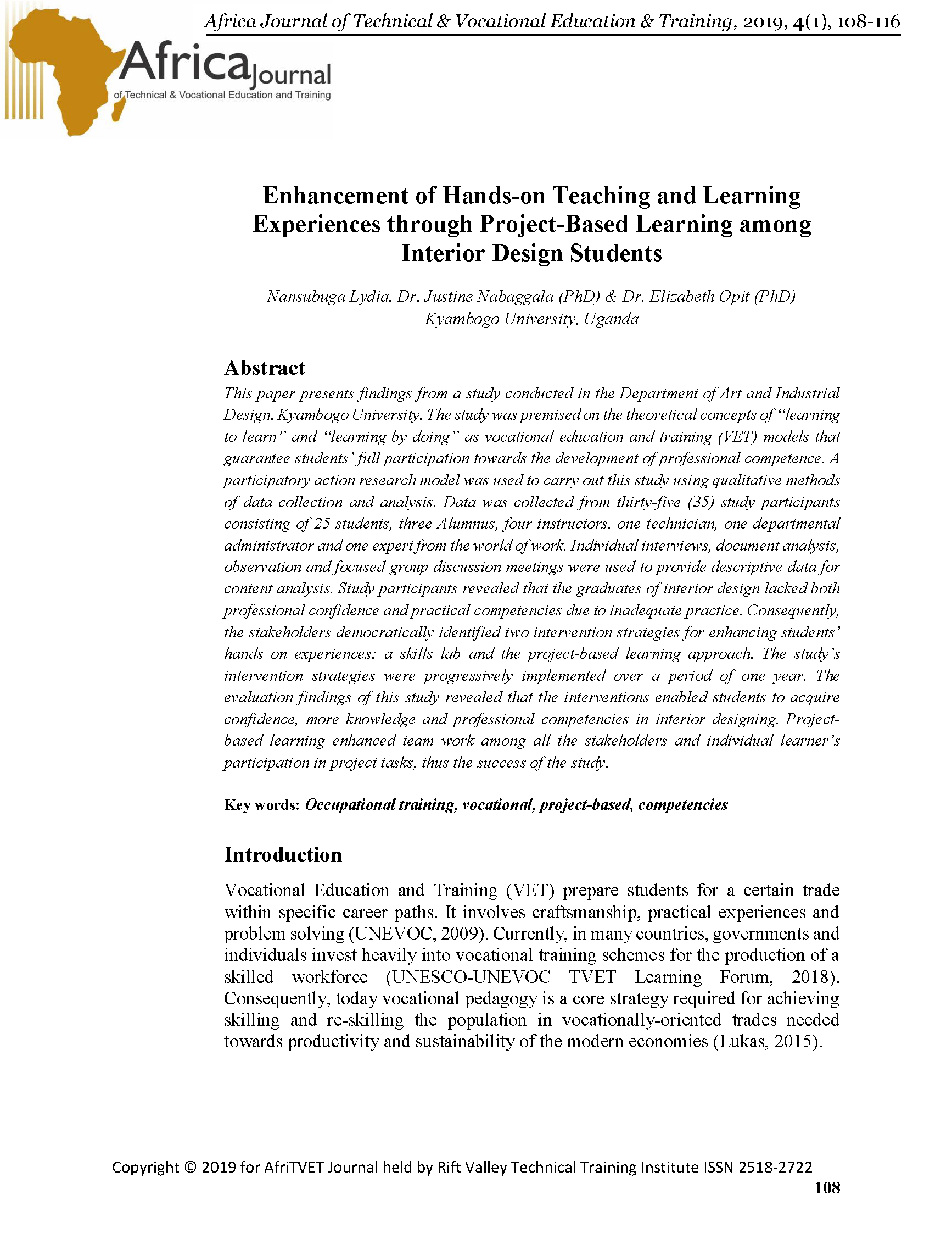 Lydia, N., Nabaggala, J., & Opit, E. (2019). Enhancement of Hands-on Teaching and Learning Experiences through Project-Based Learning among Interior Design Students. Africa Journal of Technical and Vocational Education and Training, 4(1), 108-116. Retrieved from http://www.afritvetjournal.org/index.php/Afritvet/article/view/86