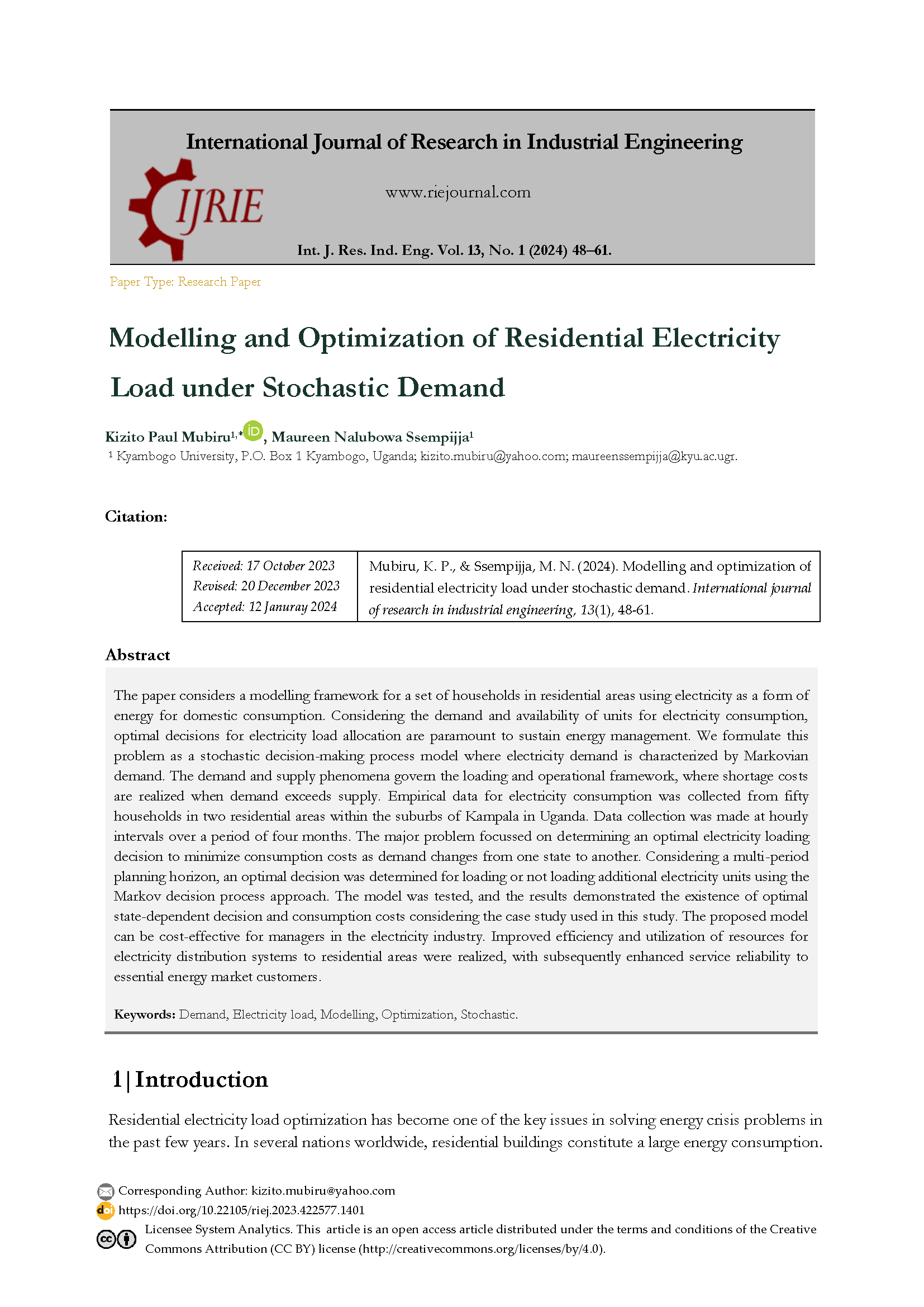Mubiru, K. P., & Ssempijja, M. N. (2024). Modelling and optimization of residential electricity load under stochastic demand. International Journal of Research in Industrial Engineering, 13(1), 48-61.
