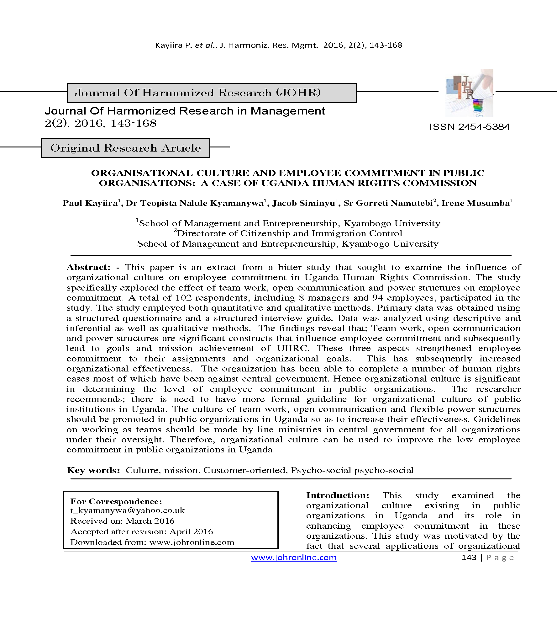 Kayiira, P., Kyamanywa, T. N., Namutebi, J. S. S. G., & Musumba, I. (2016). Journal Of Harmonized Research (JOHR). Journal Of Harmonized Research in Management, 2(2), 143-168