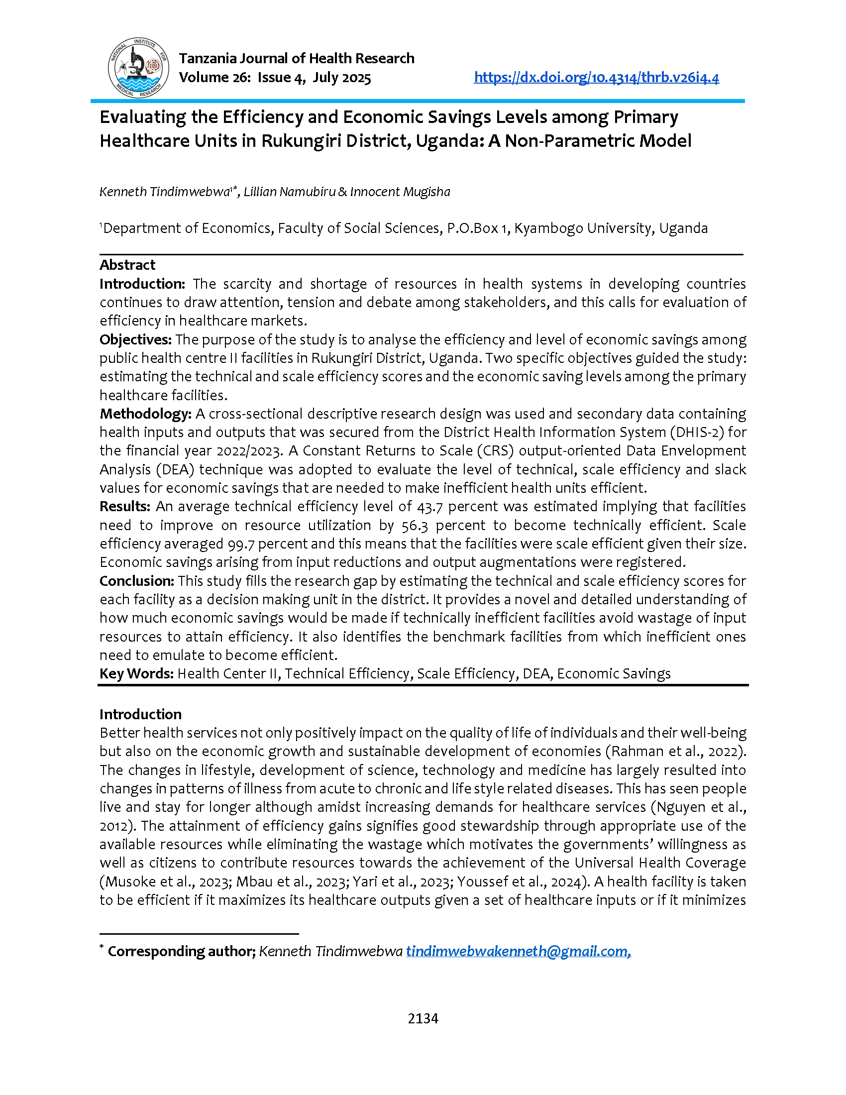 Tindimwebwa, K., Namubiru, L., & Mugisha, I. (2025). Evaluating the Efficiency and Economic Savings Levels among Primary Healthcare Units in Rukungiri District, Uganda: A Non-Parametric Model. Tanzania Journal of Health Research, 26(4).