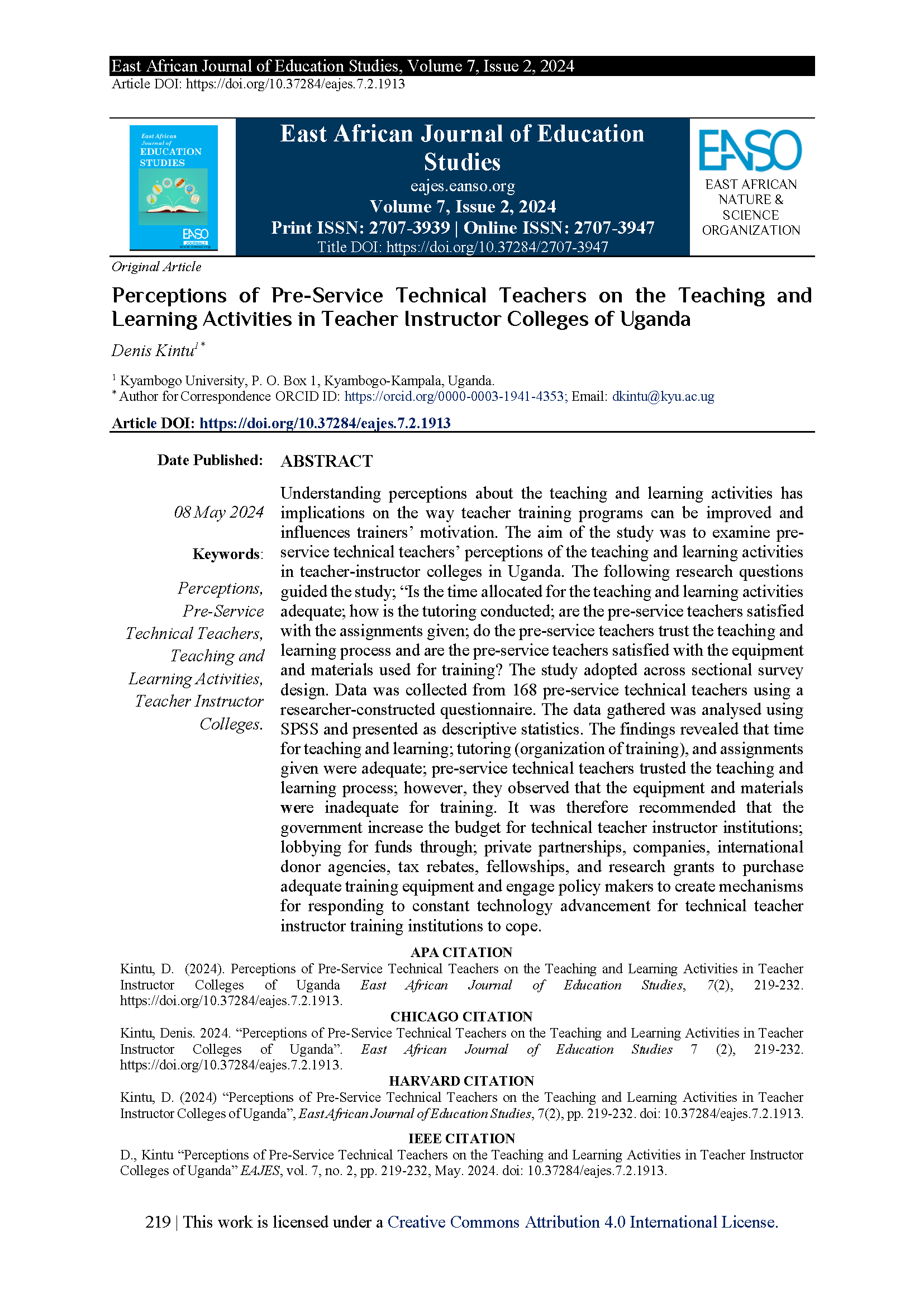 Kintu, D. (2024). Perceptions of Pre-Service Technical Teachers on the Teaching and Learning Activities in Teacher Instructor Colleges of Uganda. East African Journal of Education Studies, 7(2), 219-232.