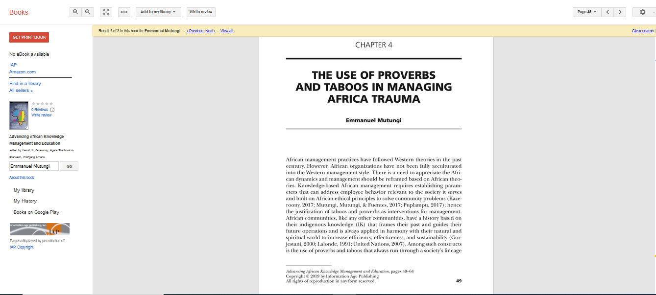 Mutungi, E. (2019). The Use of Proverbs and Taboos in Managing Africa Trauma. Advancing African Knowledge Management and Education, 49.