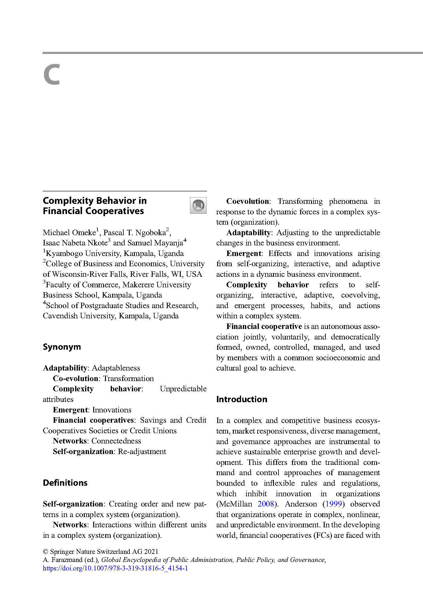 Omeke, M., Ngoboka, P. T., Nkote, I. N., & Mayanja, S. (2021). Complexity Behavior in Financial Cooperatives.