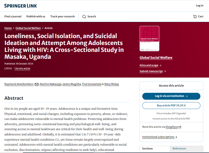 Atwebembere, R., Nakasujja, N., Mugisha, J., Ssewamala, F., & Mckay, M. (2024). Loneliness, Social Isolation, and Suicidal Ideation and Attempt Among Adolescents Living with HIV: A Cross-Sectional Study in Masaka, Uganda. Global Social Welfare, 1-7.