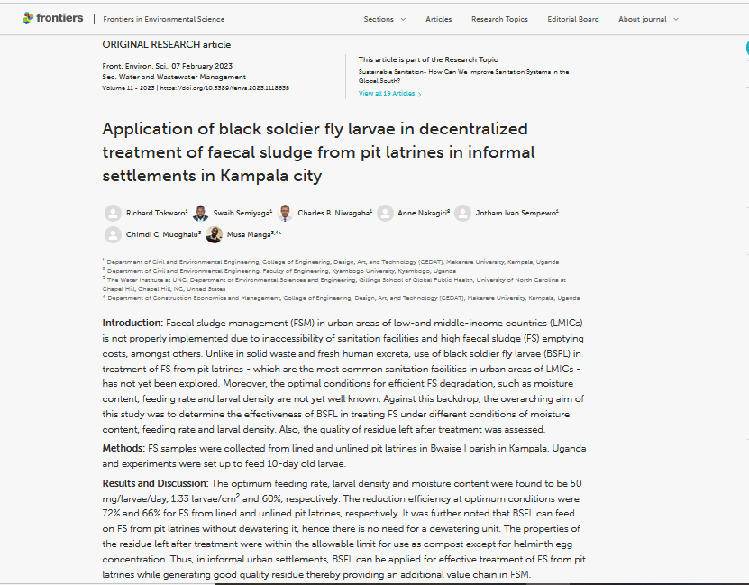 Tokwaro, R., Semiyaga, S., Niwagaba, C. B., Nakagiri, A., Sempewo, J. I., Muoghalu, C. C., & Manga, M. (2023). Application of black soldier fly larvae in decentralized treatment of faecal sludge from pit latrines in informal settlements in Kampala City. Frontiers in Environmental Science, 11, 138.