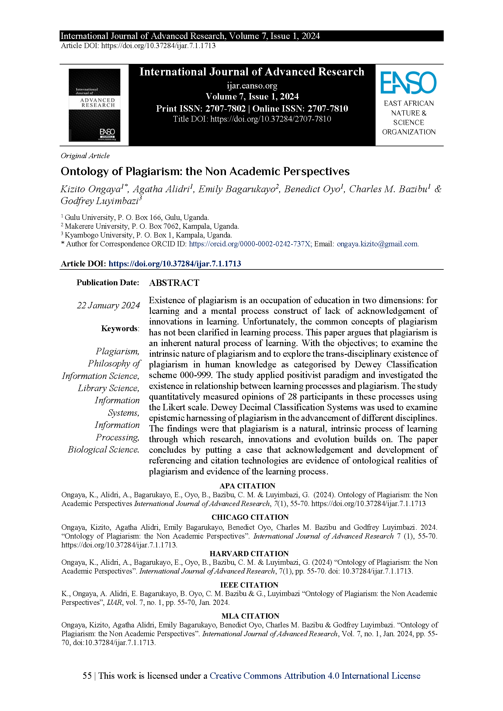 Ongaya, K., Alidri, A., Bagarukayo, E., Oyo, B., Bazibu, C. M., & Luyimbazi, G. (2024). Ontology of Plagiarism: the Non Academic Perspectives. International Journal of Advanced Research, 7(1), 55-70.