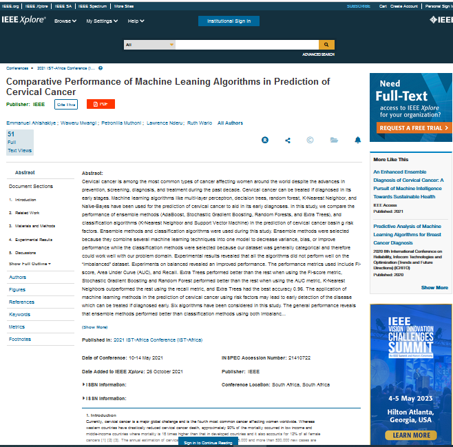 Cervical cancer, Algorithms, Machine Leaning, Comparative Performance