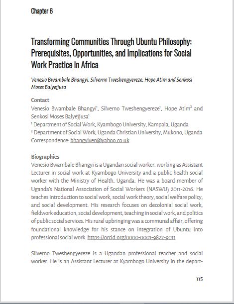 Bhangyi, V. B., Tweshengyereze, S., Atim, H., & Balyejjusa, S. M. (2023). Transforming Communities Through Ubuntu Philosophy: Prerequisites, Opportunities, and Implications for Social Work Practice in Africa. The Ubuntu Practitioner: Social Work Perspectives, 115.