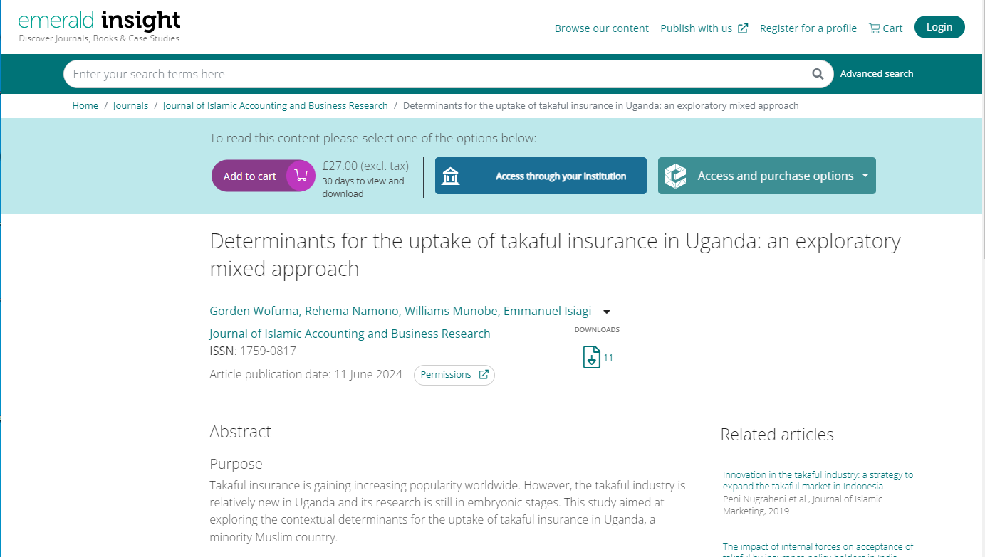 Wofuma, G., Namono, R., Munobe, W., & Isiagi, E. (2024). Determinants for the uptake of takaful insurance in Uganda: an exploratory mixed approach. Journal of Islamic Accounting and Business Research, (ahead-of-print).