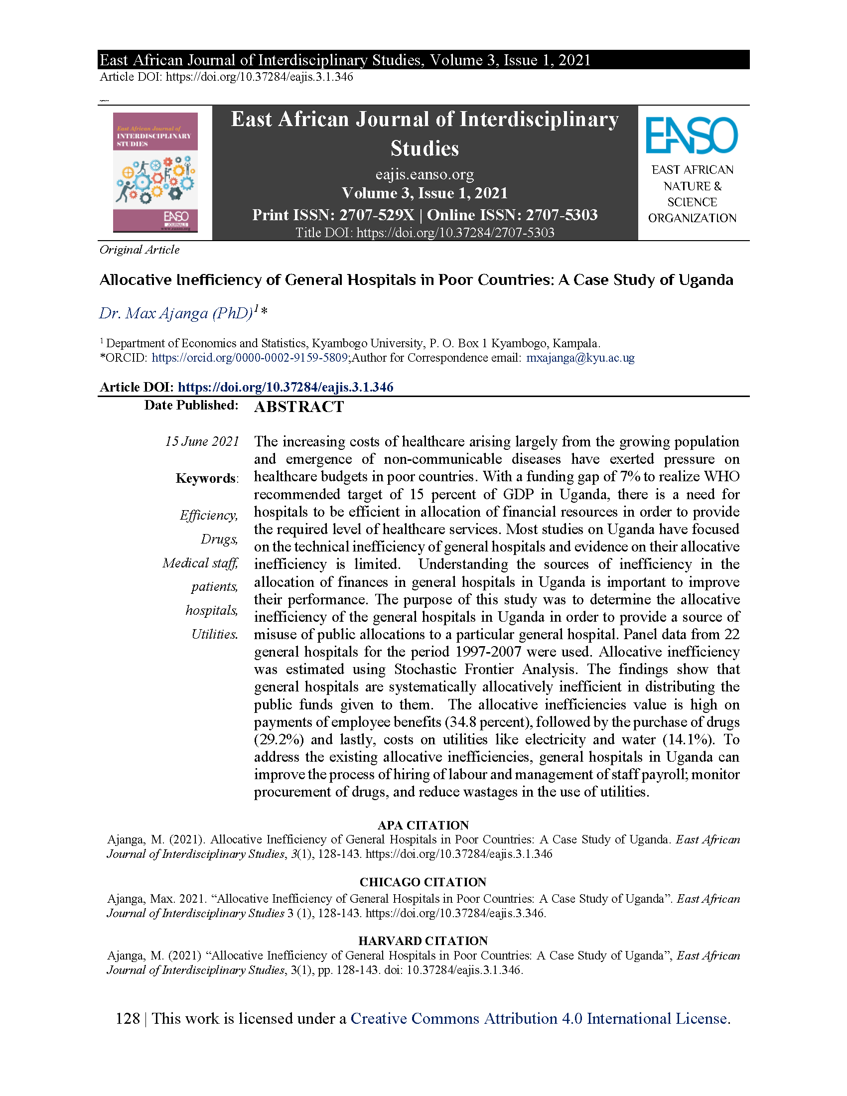 Ajanga, M. (2021). Allocative Inefficiency of General Hospitals in Poor Countries: A Case Study of Uganda. East African Journal of Interdisciplinary Studies, 3(1), 128-143.