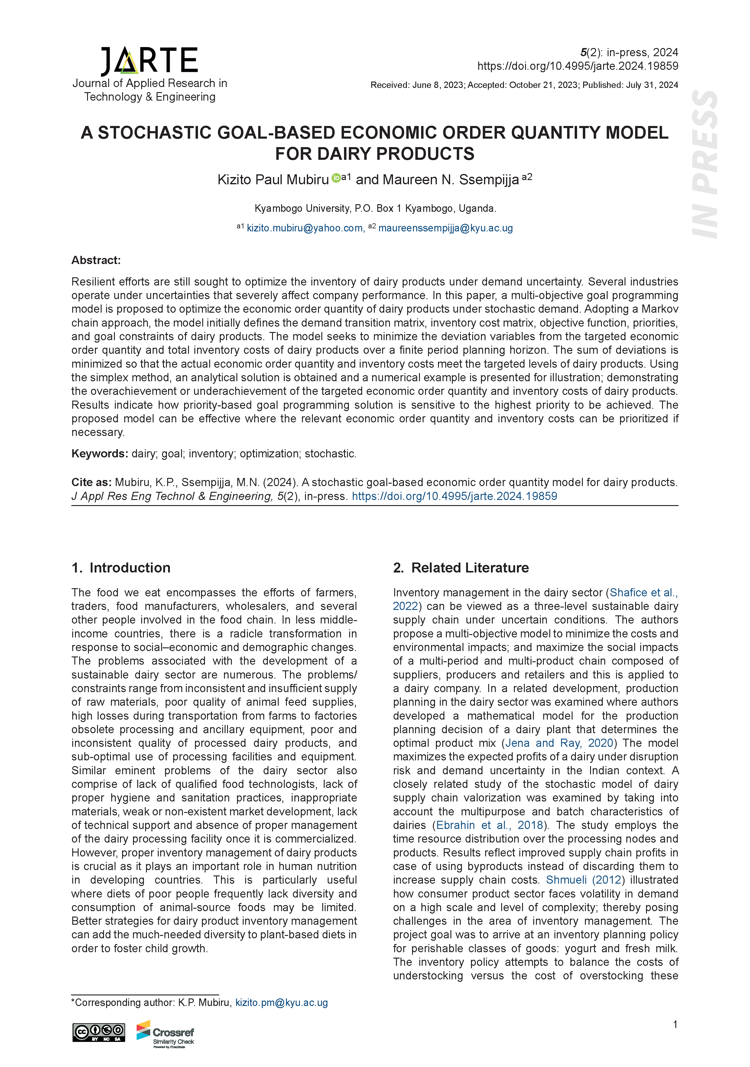 Mubiru, K. P., & Ssempijja, M. N. (2024). A Stochastic Goal-Based Economic Order Quantity Model for Dairy Products. Journal of Applied Research in Technology & Engineering, 5(2).