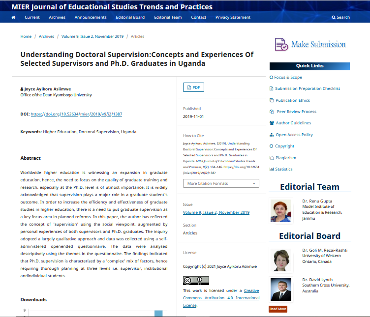 Asiimwe, J. A. (2019). Understanding Doctoral Supervision: Concepts and Experiences Of Selected Supervisors and Ph. D. Graduates in Uganda. MIER Journal of Educational Studies Trends and Practices, 134-146.